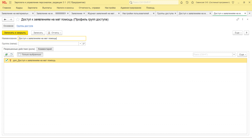 3. Создать профиль и группу доступа с ролью "доп_Доступ к заявлениям на мат помощь" и назначить её пользователям.