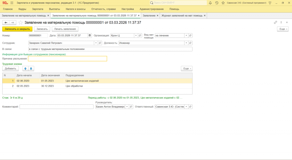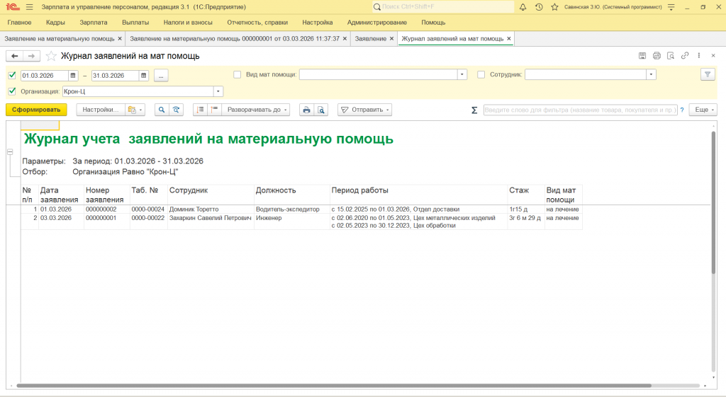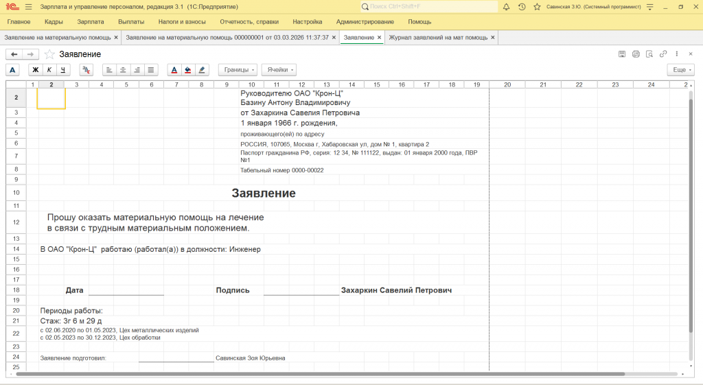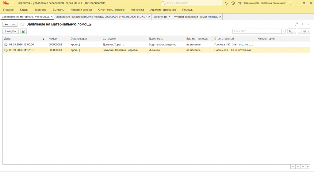 Документ Заявление на материальную помощь и журнал заявлений в ЗУП 3.1