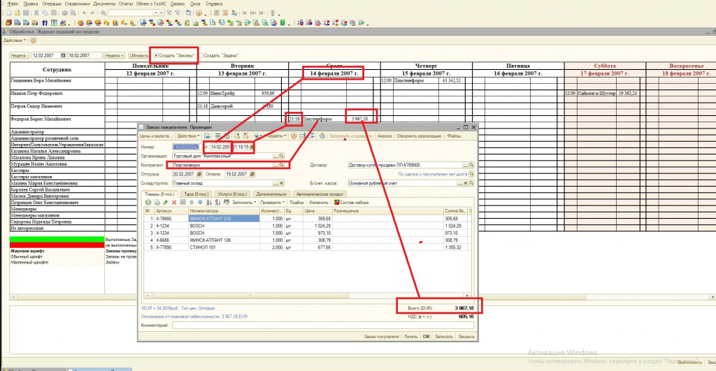 Планировщик заказов покупателя и задач на неделю по сотрудникам для УТ 10.3