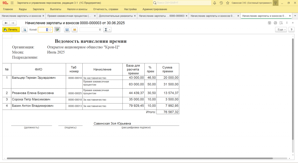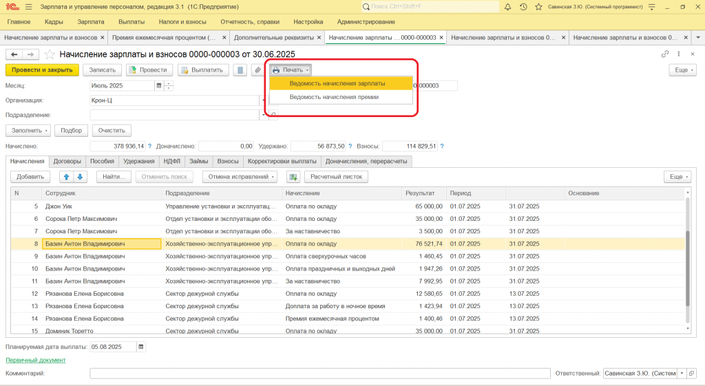 Ведомость по начислению премии, Ведомость по начислению зарплаты из документа Начисление зарплаты и взносов, ЗУП 3.1