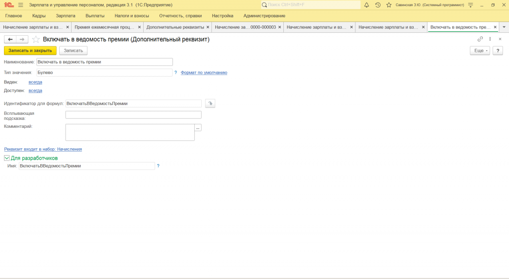- "Идентификатор для формул" и "Имя" пишем "ВключатьВВедомостьПремии".
