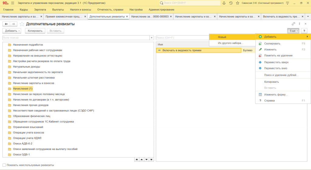 - откройте начисление, кнопка "Ещё", Изменить состав дополнительных реквизитов, Добавить, Новый
