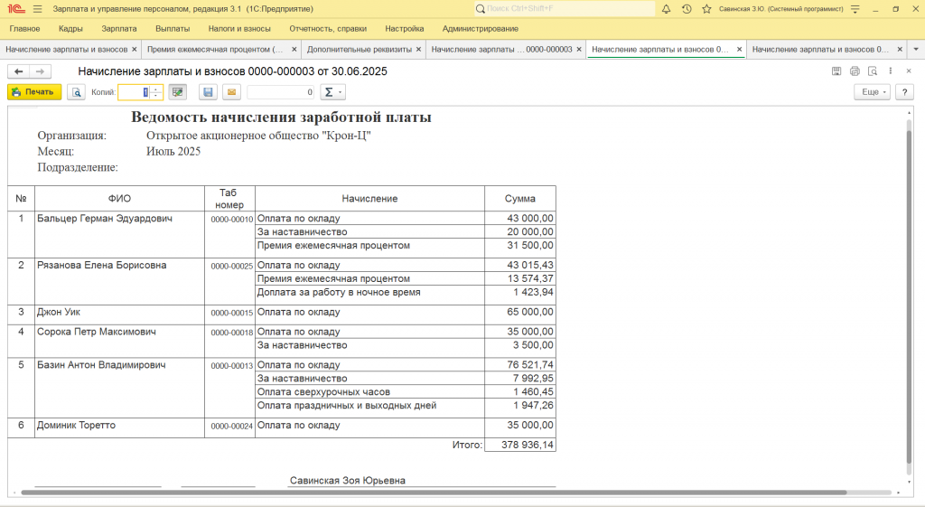 начисление зарплаты и взносов печатная форма печать ведомость премия