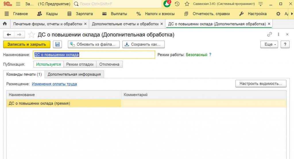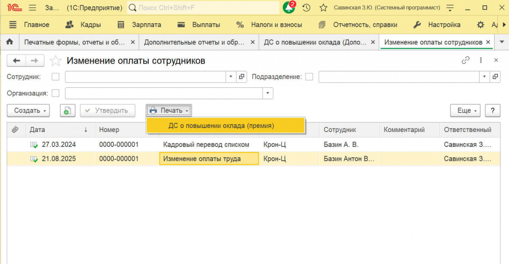 Позволяет печатать "ДС о повышении оклада" из документа "Изменение оплаты сотрудников".