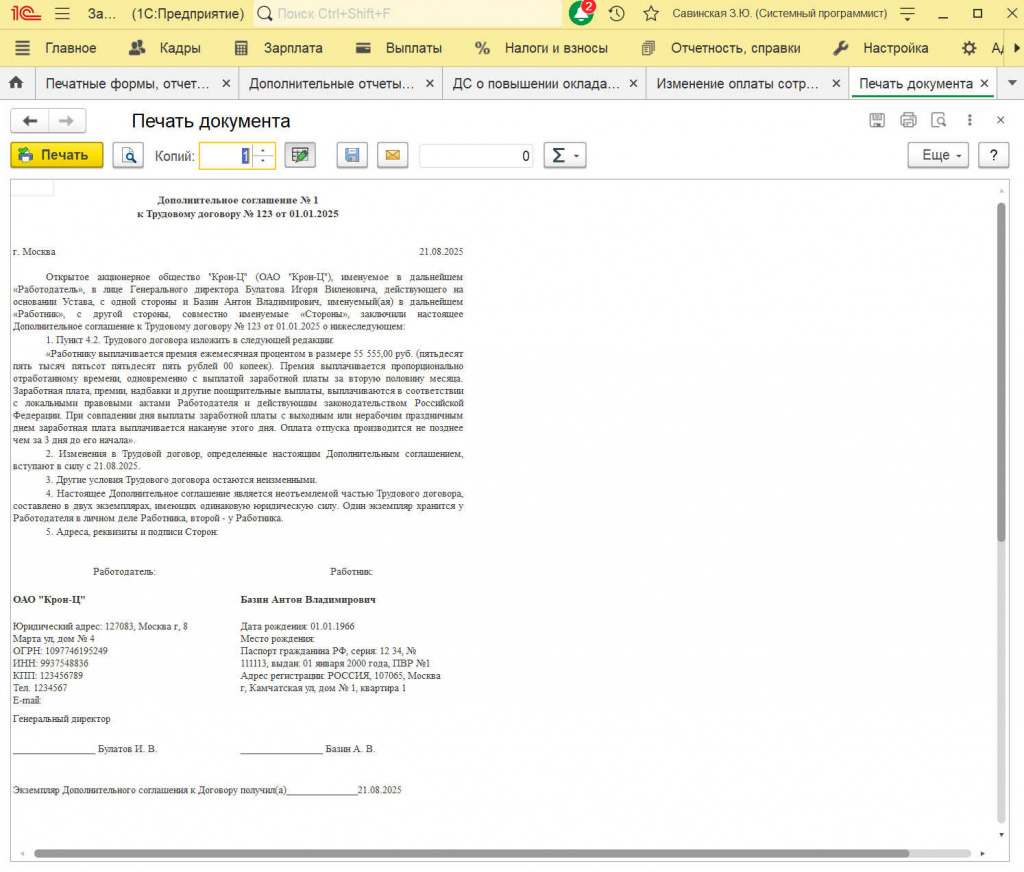 Внешняя печатная форма "Дополнительное соглашение о повышении оклада" для документа "Изменение оплаты сотрудников" в конфигурации "Зарплата и управление персоналом ред 3.1"