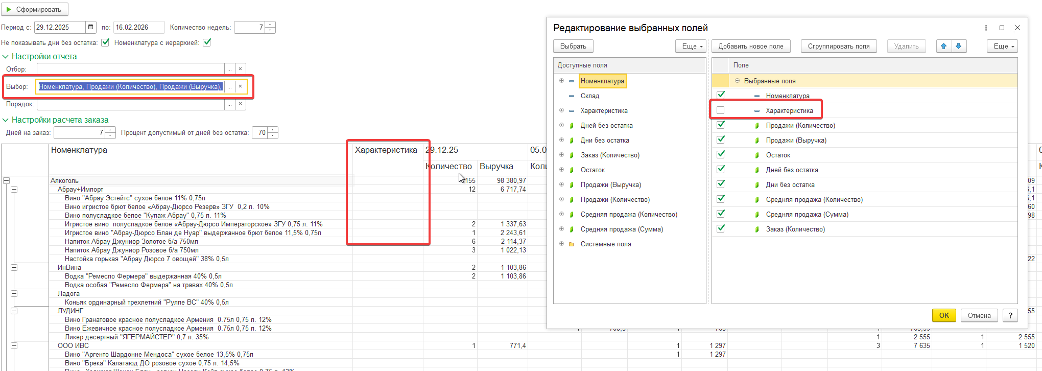 - В группе "Настройка отчета" возможно установить отборы, выбрать поля отчета, порядок.