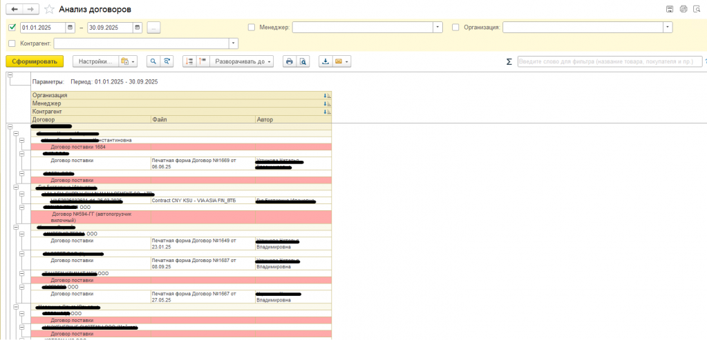 - Контрагент: можно выбрать договора по определенному контрагенту