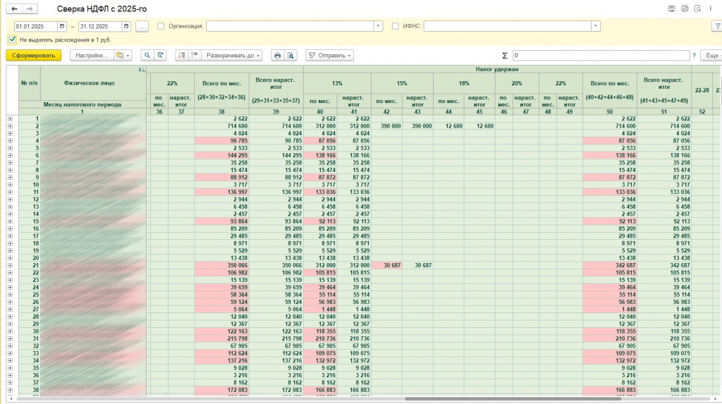 Отчет по НДФЛ для сверки исчисленного и удержанного налогов в разрезе новых ставок НДФЛ.