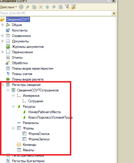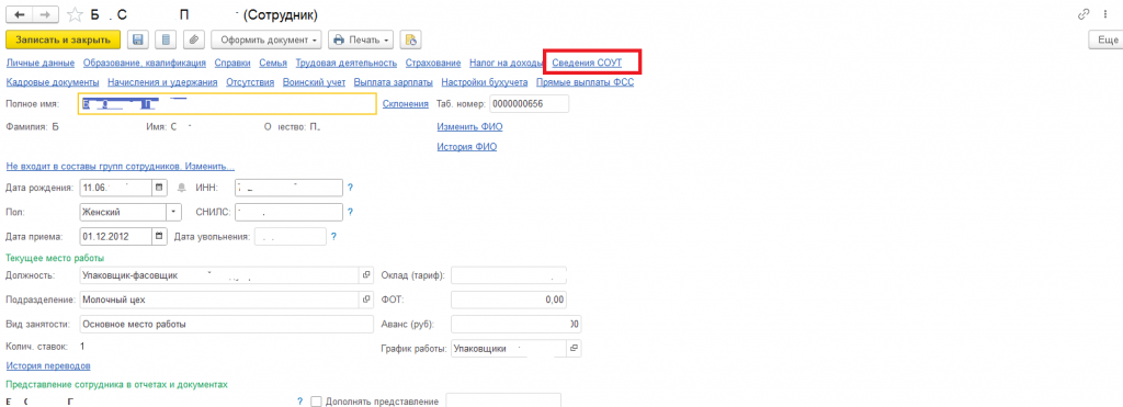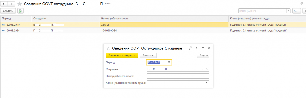 Решение реализовано через расширение конфигурации. Периодический регистр сведений заполняется через карточку сотрудника и хранит данные по номеру рабочего места и классу (подклассу) условий труда.