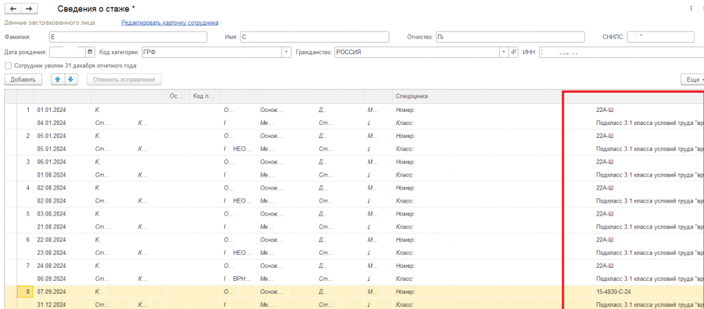 Заполнение отчета реализовано через директиву "&После". Т.е. сначала отчет заполняется сведениями по стажу через алгоритм разработчиков, далее графы по спецоценке отчета заполняются из регистра сведений.