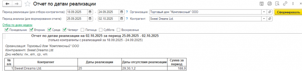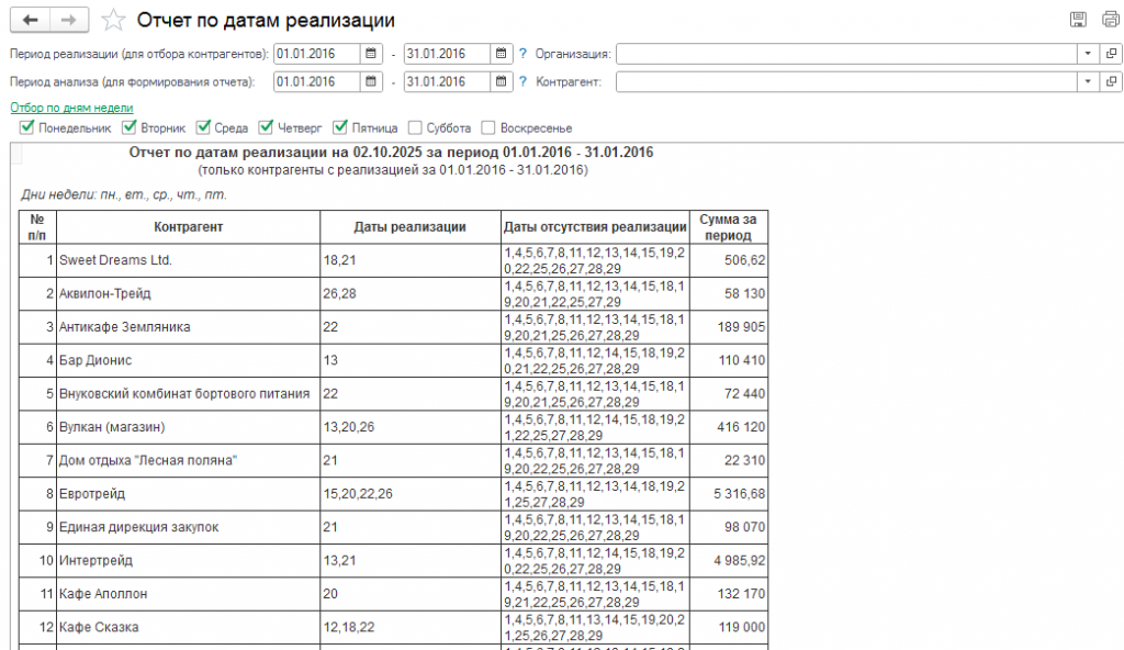 Отчет содержит отборы по контрагенту и организации, отбор по дням недели(использует производственный календарь по коду "РФ")