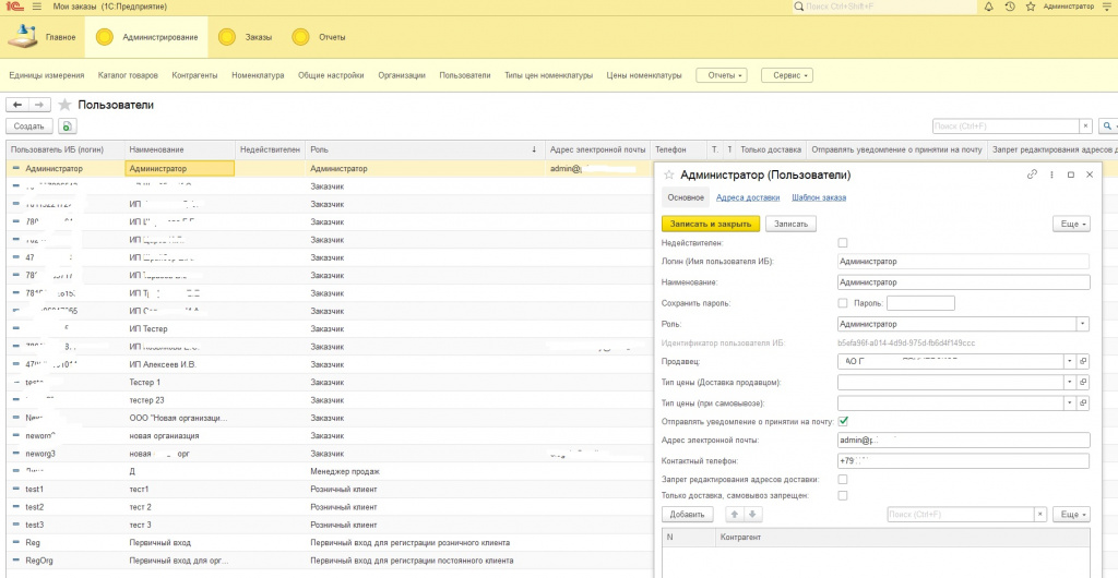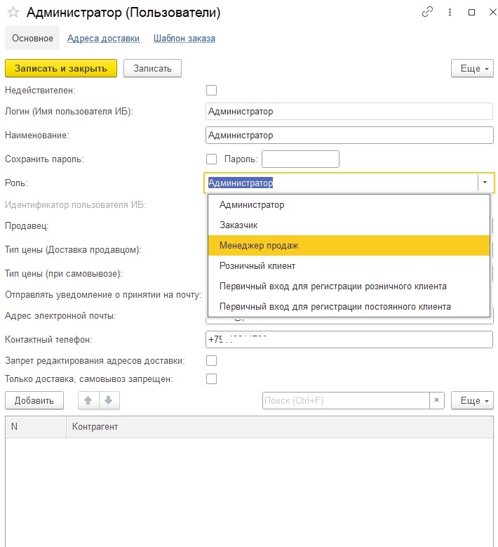 3. При создании учетных записей заказчиков необходимо назначить доступных для выбора контрагентов - это понадобится для выбора в заказе доступных покупателей и для дальнейшей выгрузки заказов в 1С: Бухгалтерию
