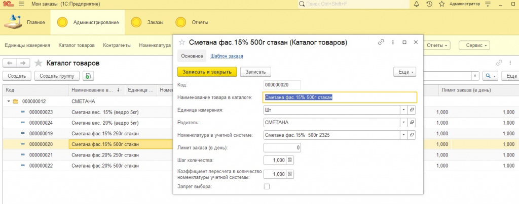 2.Отдельный каталог товаров - возможность привести каталог товаров для заказов в удобно воспринимаемый вид для клиента и сопоставить с учетной номенклатурой. Поддерживается иерархия справочника. Доступны в карточке товара: шаг увеличения или уменьшения количества, Коэффициент пересчета , лимит заказа товара в день, запрет выбора