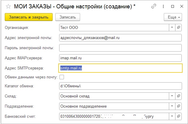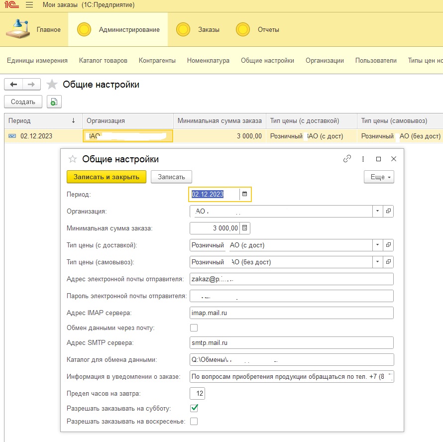 4. Общие настройки обязательны к заполнению. Необходимо указать папку для обмена заказов, лимиты заказа, организацию-продавца по умолчанию, типы цен с доставкой и без доставки, электронную почту для отправки различных уведомлений (обмена самими заказами) и прочее.