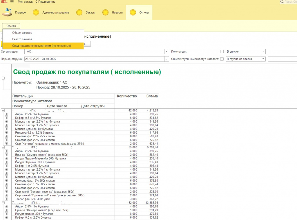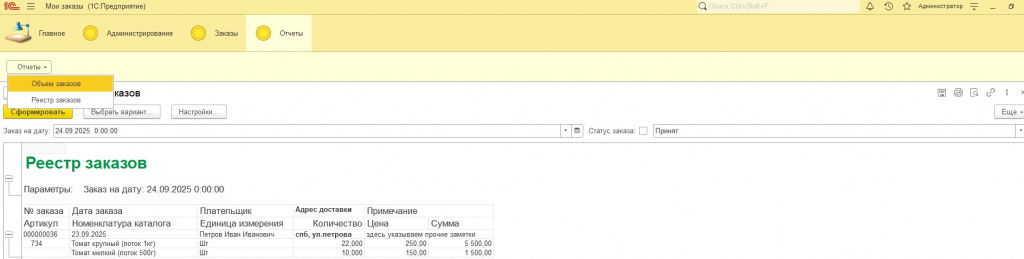 9. Отчеты. Реестр заказов подробный, свод продаж по покупателям, Объем заказов по видам товаров