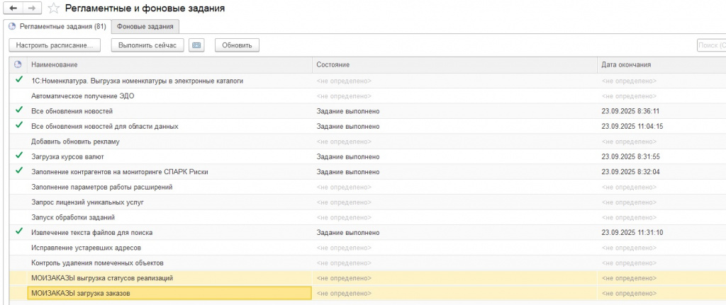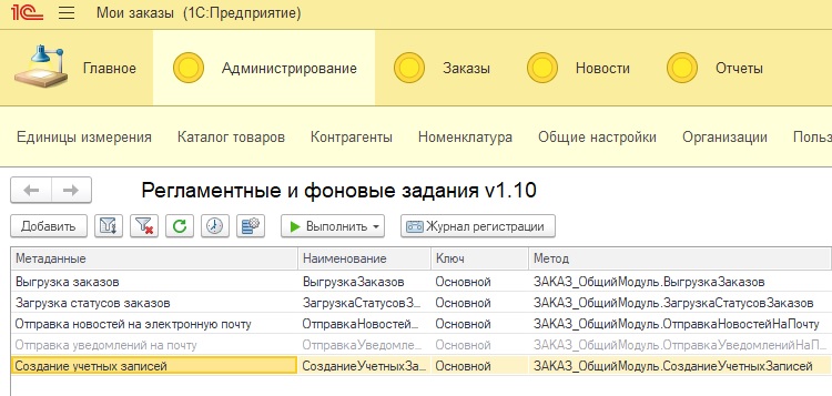 7.Регламентные фоновые задания.Встроенные задания для выгрузки заказов, загрузки идентификаторов документов реализации, отправка уведомления о принятия заказа на электронную почту, создание учетных записей розничных клиентов
