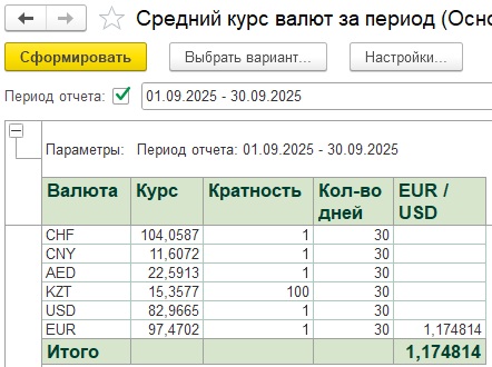 Отчет формирует средний курс валют за период, и выводит отношение евро к доллару.