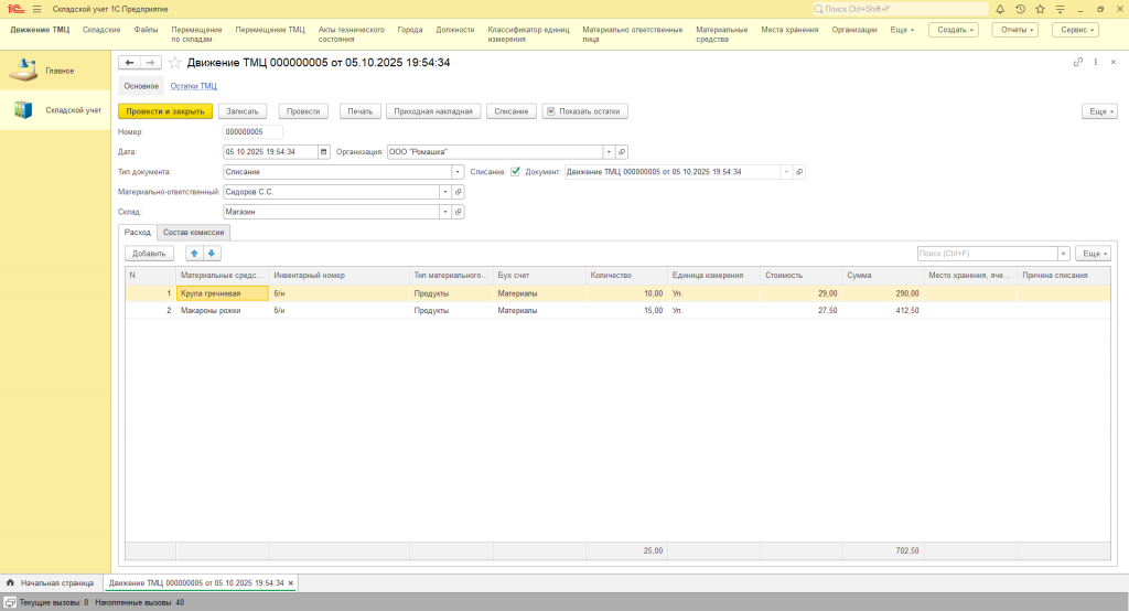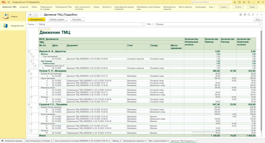 Документ «Перемещение ТМЦ» позволяет организовать учет перемещения ТМЦ как между складами у материально-ответственного лица, так и между материально-ответственными лицами, при этом так же можно распечатать акт о приеме-передаче товарно-материальных ценностей. Здесь так же реализован механизм учета наличия ТМЦ как на складе, так и у материально-ответственного лица.