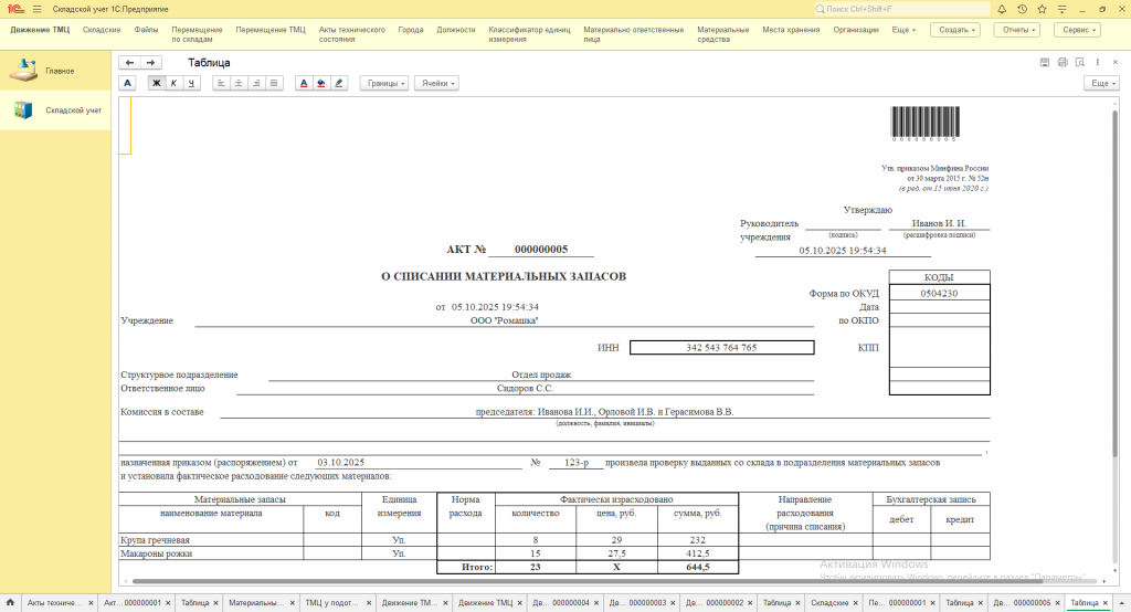 Учет ТМЦ организован документами «Движение ТМЦ» и «Перемещение ТМЦ». Документ «Движение ТМЦ» позволяет принять ТМЦ на баланс материально-ответственного лица, определить на каком складе будет числиться имущество, а также предусмотрена возможность уточнения конкретной позиции хранения ТМЦ на складе, то есть складом может быть к примеру Какой-либо филиал, а местом – номер кабинета в котором расположено имущество или же это может быть конкретный склад и конкретная полка на стеллаже в этом складе. Также документ «Движение ТМЦ» позволяет списывать ТМЦ с подотчетного лица, при этом учитывается наличие ТМЦ на складе, то есть нельзя провести документ в минус по остатку на складе. На любой вид движения имеется возможность печати документов – для поступления ТМЦ это приходный ордер, а для списания – акт о списании материальных запасов. Причем для списания есть возможность подготовить акт технического состояния материальных ценностей и указать его в основании для списания.