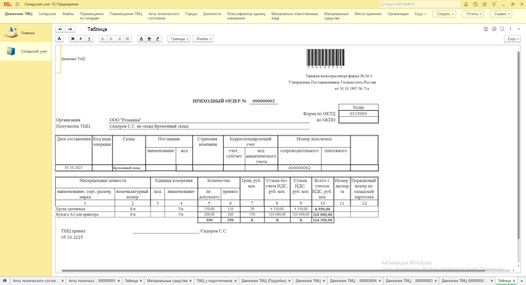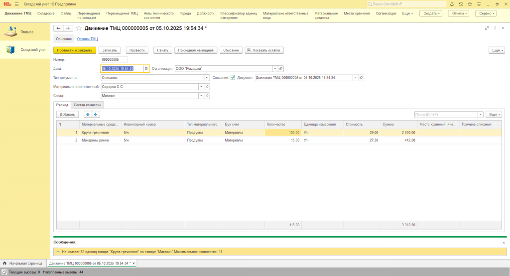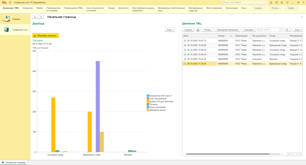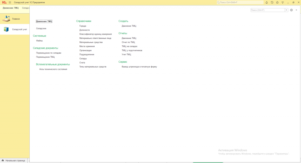 Конфигурация разработана для организации складского учета на предприятии. Среди основных возможностей конфигурации хочется отметить возможность количественного и стоимостного учета товарно-материальных ценностей (далее – ТМЦ), находящихся на балансе у материально-ответственных лиц.
