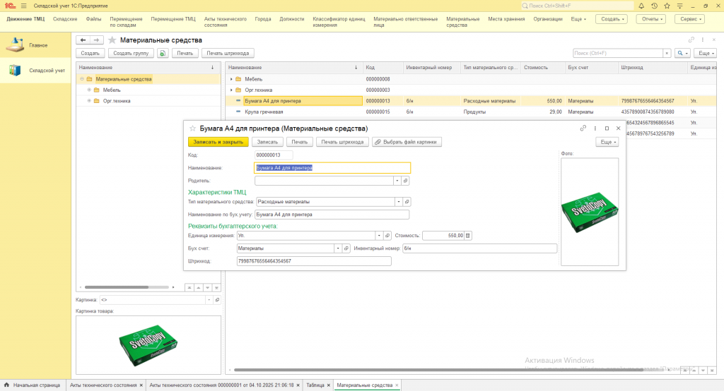Конфигурация позволяет вести номенклатуру ТМЦ, учитывая единицы измерения, стоимость, номер счета по бухгалтерскому учету, инвентарный номер, а также прикреплять фотокарточку и выводить штрихкод для каждой позиции.
