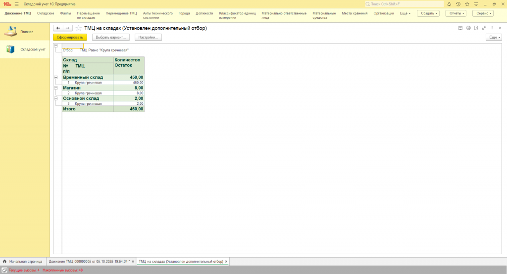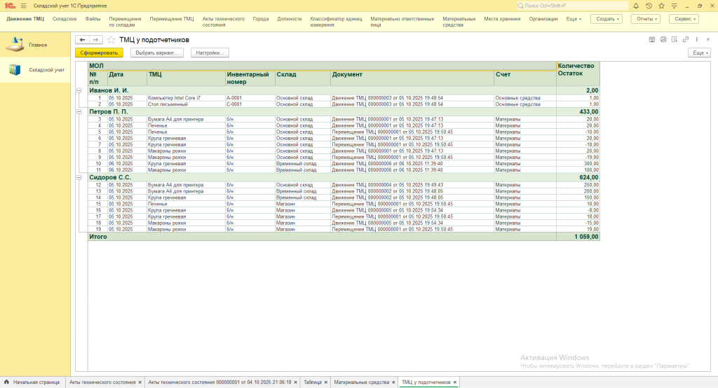 Конфигурация позволяет выводить отчеты. Всего реализовано пять отчетов – «Движение ТМЦ», «Отчет по ТМЦ», «ТМЦ на складах», «ТМЦ у подотчетников» и «Учет ТМЦ». В отчетах предусмотрены различные варианты отбора – по складам, по инвентарным номерам, по номенклатуре, по материально-ответственному лицу.