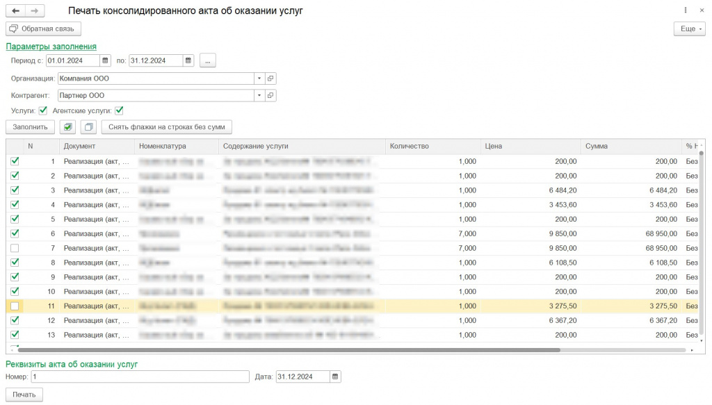 Обработка собирает и печатает один акт об оказании услуг из множества документов реализации и их корректировок за период. Идеально для консолидации данных перед передачей контрагенту.