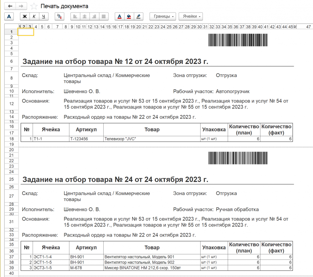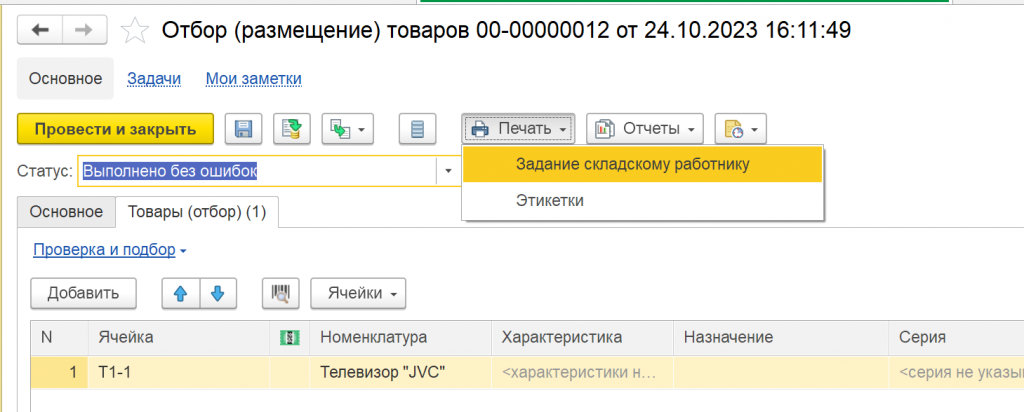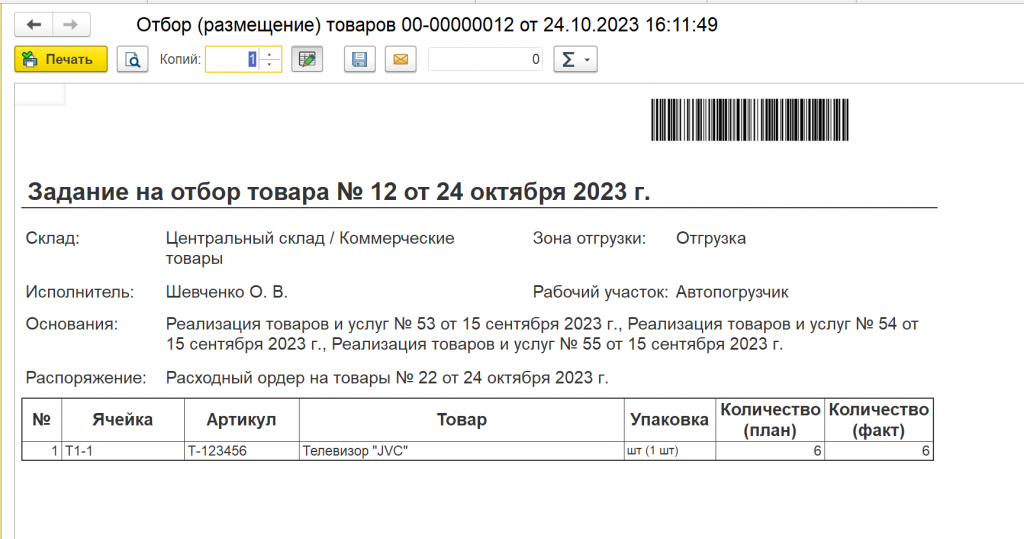 На печать будут выводиться все задания на отбор товаров, которые привязаны к документу "Расходный ордер на товары", что позволит сэкономить время, так как уже не надо будет открывать каждый документ "Отбор (размещение) товаров".