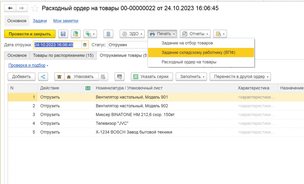 Теперь появилась возможность из документа "Расходный ордер на товары" водить на печать "Задание складскому работнику".