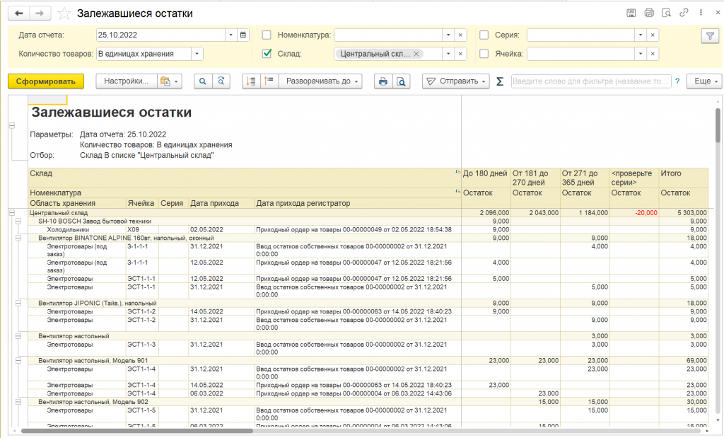 Он показывает остатки на складах неликвидного товара и показывает, какой срок этот товар не продается. Срок разделен на разные периоды: до 90 дней, до 180 дней, от 181 до 270 дней и т.д.