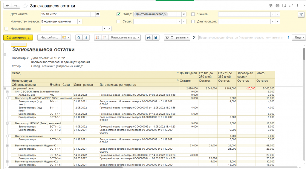Он показывает остатки на складах неликвидного товара и показывает, какой срок этот товар не продается. Срок разделен на разные периоды: до 90 дней, до 180 дней, от 181 до 270 дней и т.д.