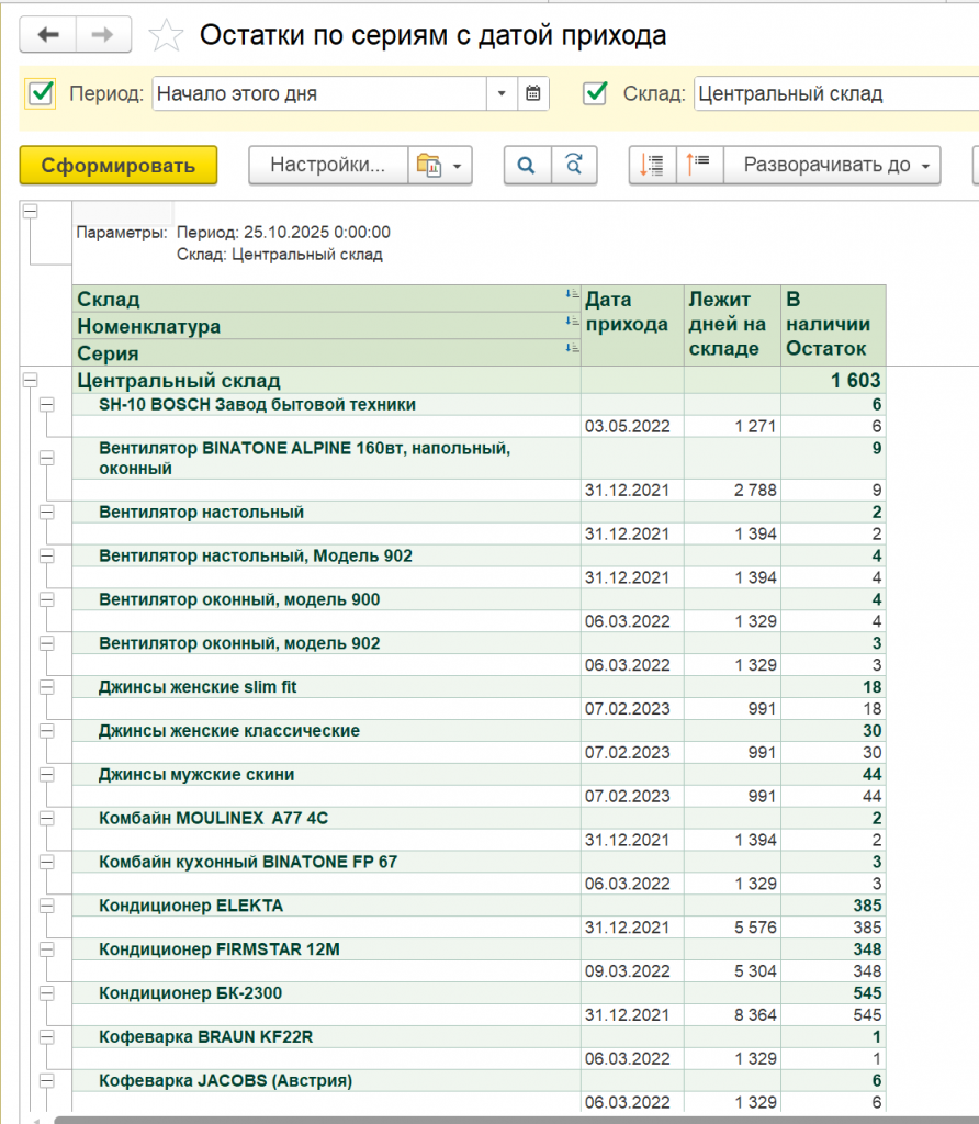 Представляю Вашему вниманию внешний отчет "Остатки номенклатуры по сериям с датой прихода". При желании этот отчет можно легко доработать под свои нужды.