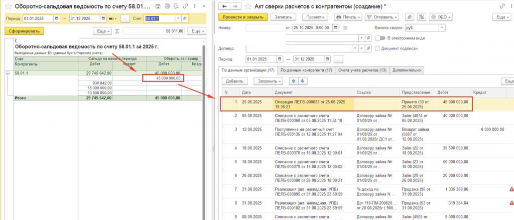 Сверка расчетов по финансовым вложениям, паям, акциям, долговым ценным бумагам (58.01.1, 58.01.2, 58.02)