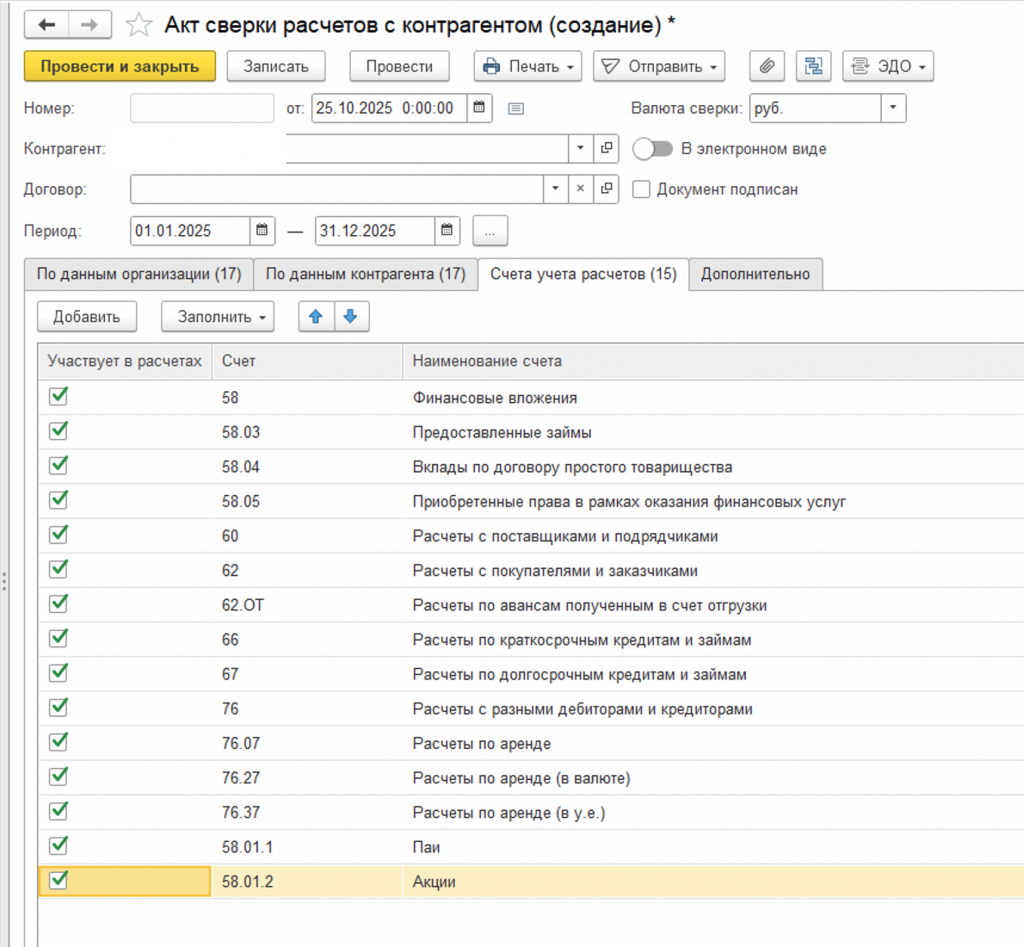При наличии оборотов по 58 счету на счетах без субконто "Договоры" данные будут попадать в документ "Акт сверки расчетов" наряду со счетами с субконто "Договоры". Также заполняется колонка "Документ".