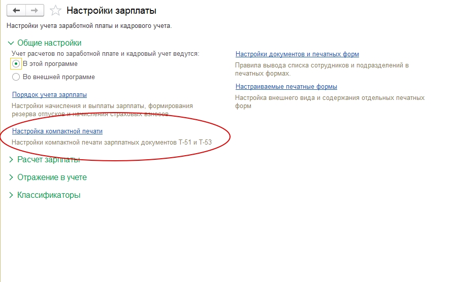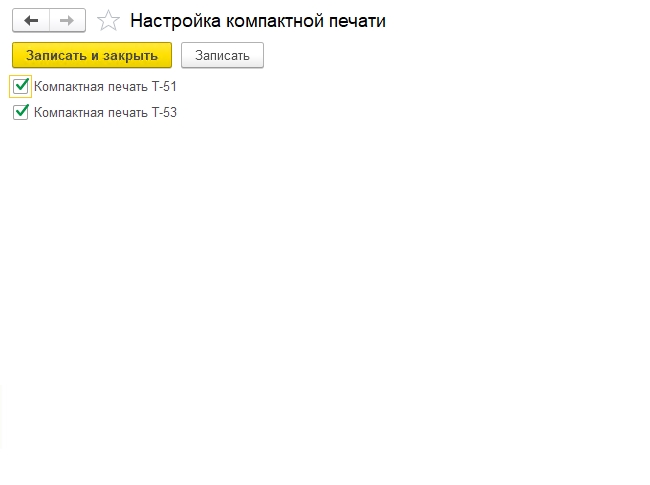Расширение позволяет включать и отключать компактную печать, просто зайдите в настройки («Зарплата и кадры» -> «Настройки зарплаты» -> «Настройка компактной печати») и выберите для какой формы необходимо включить компактную печать.