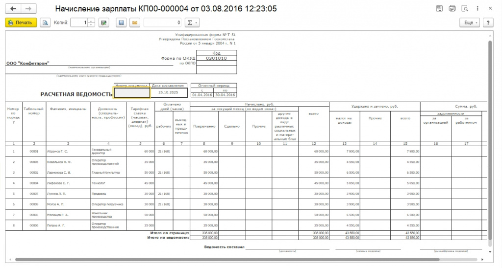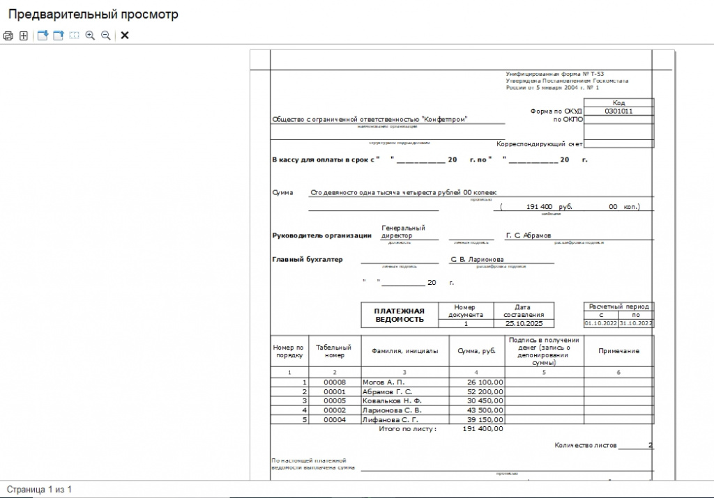• Расширение не меняет регламентированную форму ведомостей Т-51 и Т-53, а только оптимизирует их для печати, сохраняя все обязательные реквизиты.