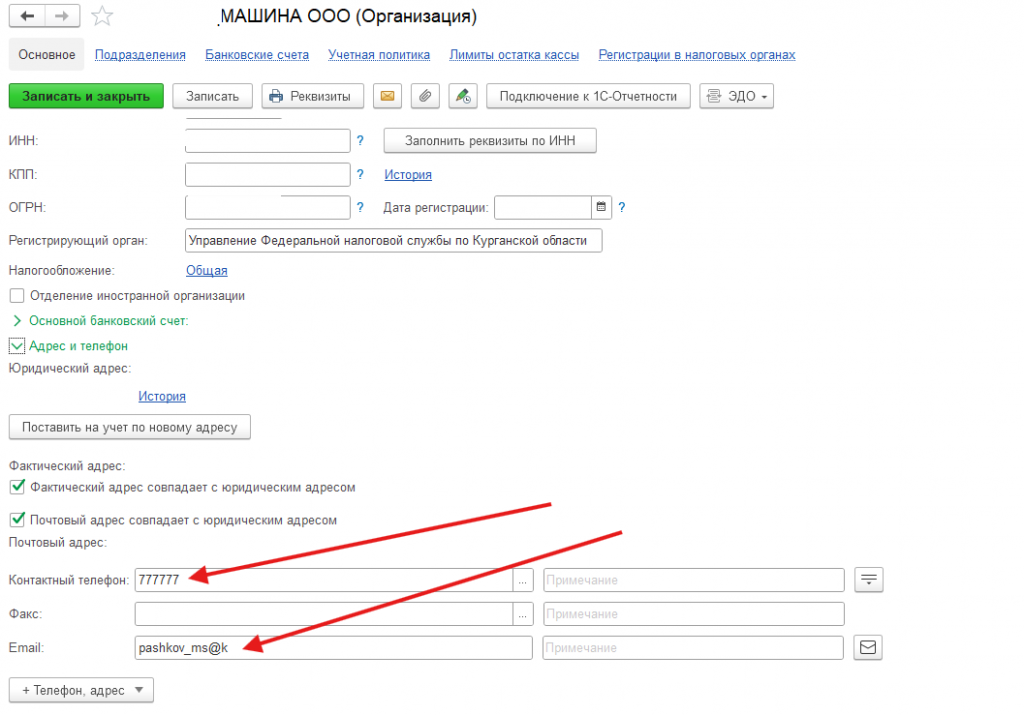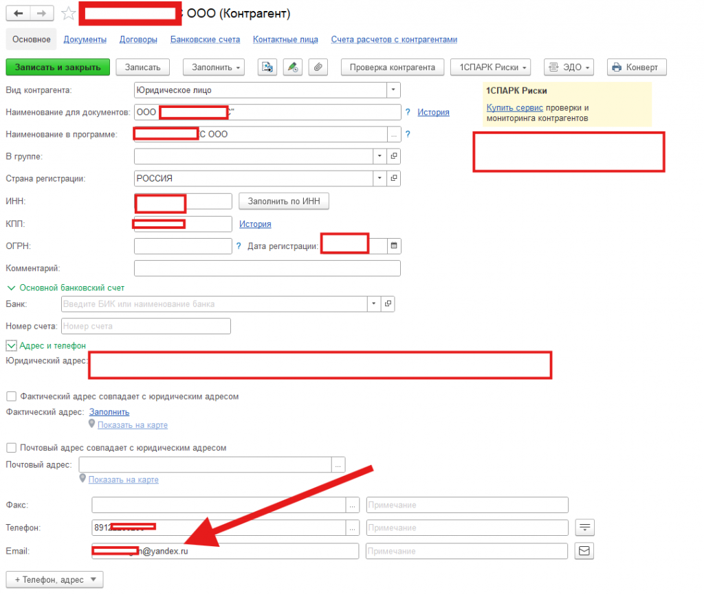 7) Отметьте галочками контрагентов, по которым необходимо сформировать акты сверки, во второй колонке указаны Email адреса этих контрагентов, в случае отсутствия строка будет коричневого цвета. Email адрес контрагента можно дописать прям в таблице или в самом контрагенте как на рисунке ниже.