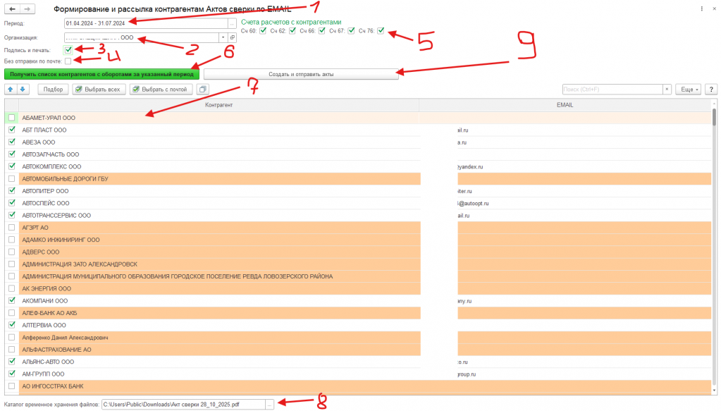 9) Кнопка непосредственно осуществляет программное создание актов сверок по массиву контрагентов и отправку по email адресам в формате pdf.