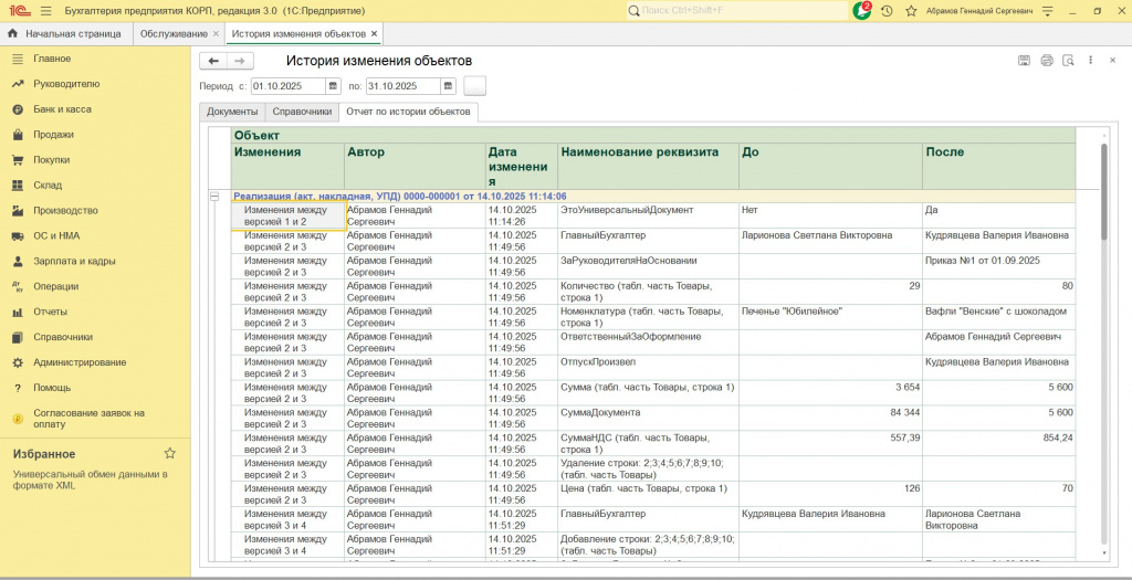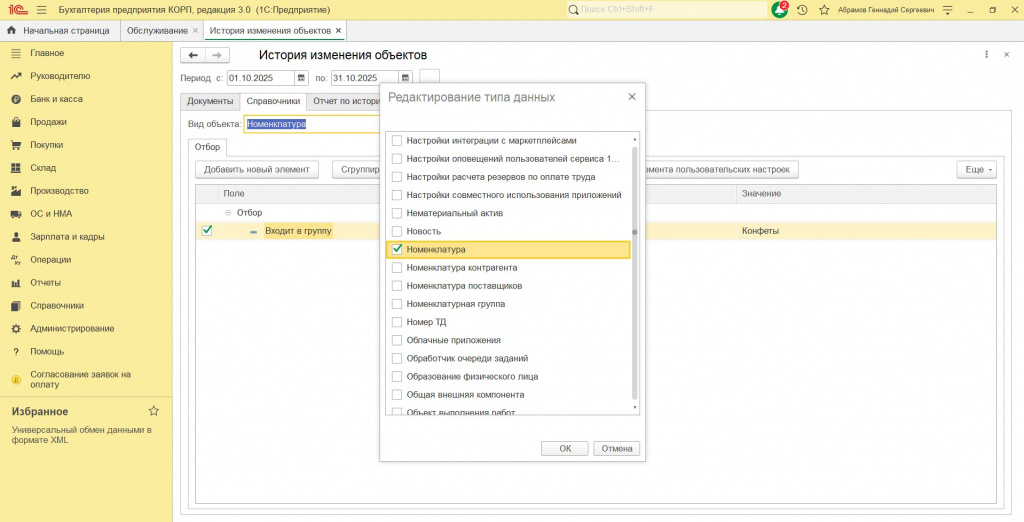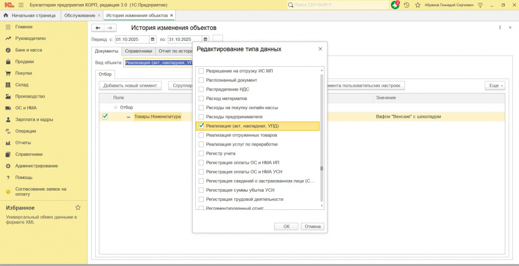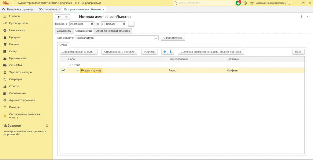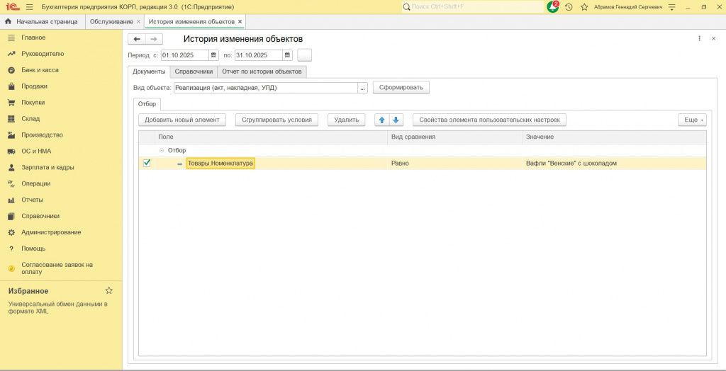 Кроме периода изменений, можно задавать гибкий набор условий по выбранным объектам (включая условия по табличным частям).