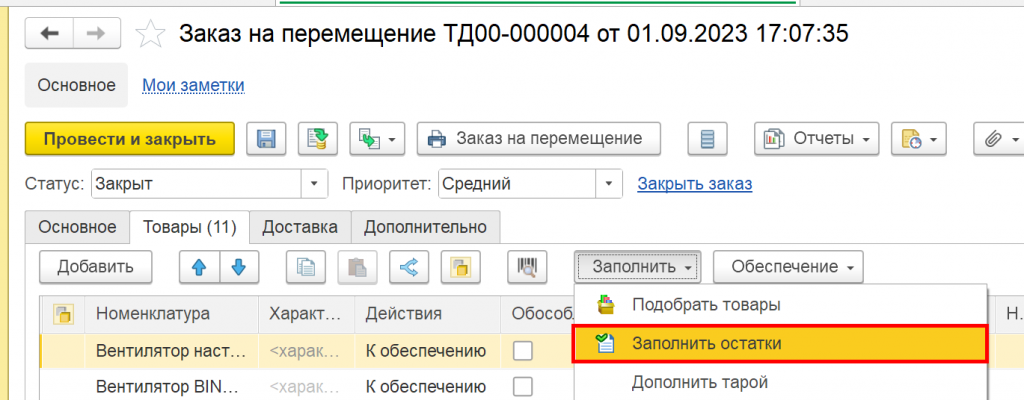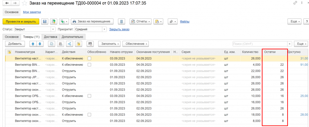 Перейдем к документу "Заказ на перемещение" и откроем ранее созданный документ. Там должна быть заполненная колонка "Остатки".