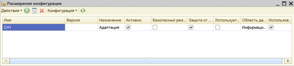 Для начала надо подключить данное расширение к базе. Делается это стандартным способом. В конфигураторе, через главное меню выполнить последовательность команд: "Конфигурация" - "Расширения конфигурации".