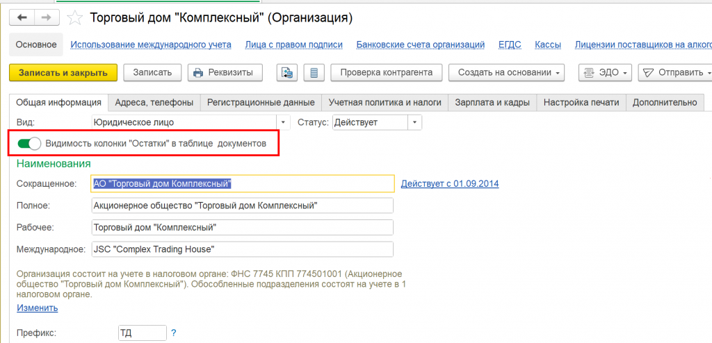 После чего, в режиме 1С:Предприятие запускаем базу и переходим в справочник "Организации". Там должен появиться новый реквизит "Видимость колонки "Остатки" в таблице документов". По умолчанию он будет выключен. Его надо будет обязательно включить, чтобы появилась колонка "Остатки".