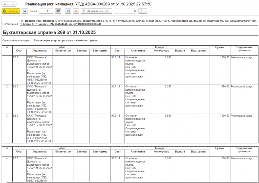 Выходная форма аналогична типовой форме, но главное достоинство именно этого решения в том, что она подходит для всех видов документов программ ERP-2, КА-2 и БП-3, которые способны иметь проводки.