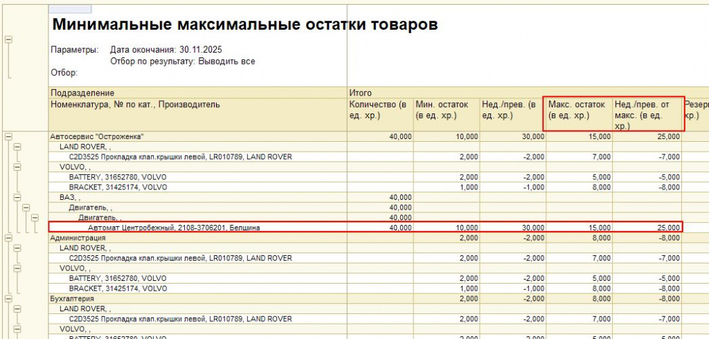 В отчете по минимальным остаткам в Альфа авто 5, показатель недостатка остатков товара рассчитывается исходя из минимального остатка. В данный отчет добавлен показатель максимального запаса, а также показатель недостатка товара исходя из установленного максимального запаса (нормы хранения)