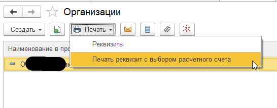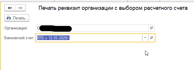 Печать реквизита организации с выбором расчетного счета