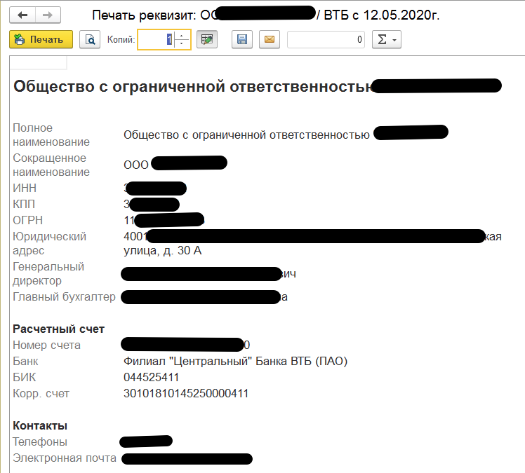 Возможность вывести на печать реквизиты организации с выбором нужного расчетного счета для 1С:Бухгалтерии 3.0.