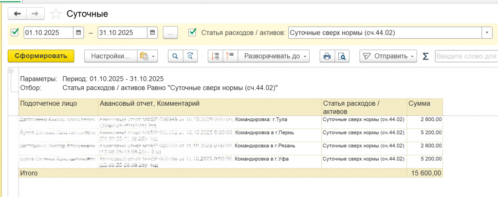В отчете реализовано два варианта - Суточные (основной) и Авансовые отчеты.