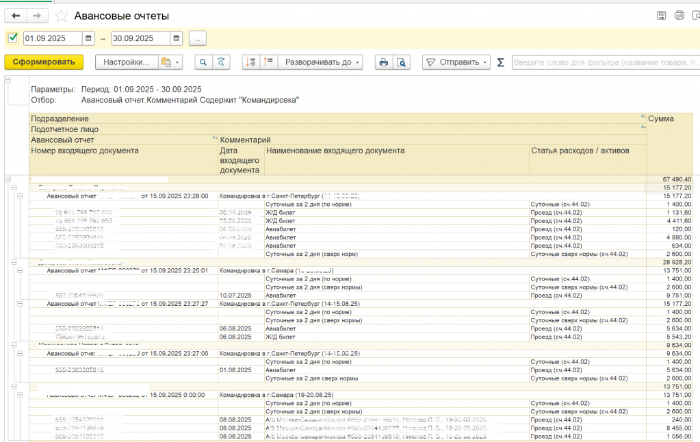 2. Авансовые отчеты - отчет формирует за период все документы с группировкой по подразделениям и сотрудникам. Выводятся сведения авансовых отчетов.