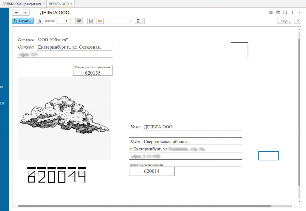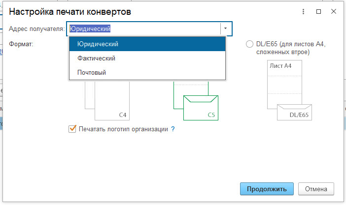 При выборе печатной формы для вывода откроется промежуточная форма для выбора типа конверта (размера) и выводимого адреса получателя (контрагента). От "Организации" в печатную формы подбирается строго "Почтовый адрес организации".