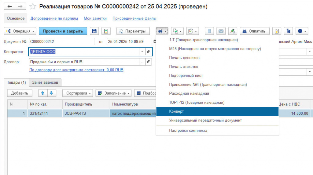 Рис. 3. Пункт "Конверт" меню печати документа "Реализация товаров".